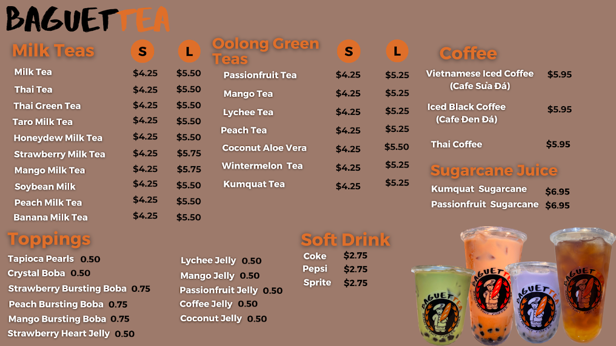 Welcome to Baguettea, a gem nestled in Houston, TX, offering a delightful fusion of drinks and dishes that bring the heart of Vietnamese cuisine to life. Known for their refreshing milk teas and unique flavors like Thai Tea, Taro Milk Tea, and invigorating Mango Tea, this café promises an excellent beverage experience.